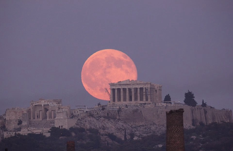A dusky early evening left a soft glow on the Acropolis, periodically visible as I walked from the hostel toward the church. Yet, the size and warmth of the rising full moon held my attention as its blush touched the hills, for a brief while silhouetting the pillars and pediments of the Parthenon.