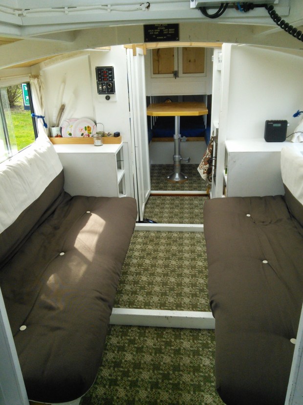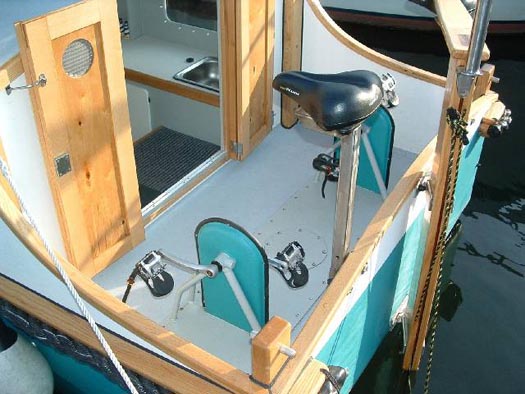 It is the shallow draft and relative compactness of the Escargot design that permits boaters manually to propel her, whether by oars and paddles, and or by pedal-powered propellers, and into more intimate waters. The cockpit of a European pedal-propelled Escargot is pictured below.