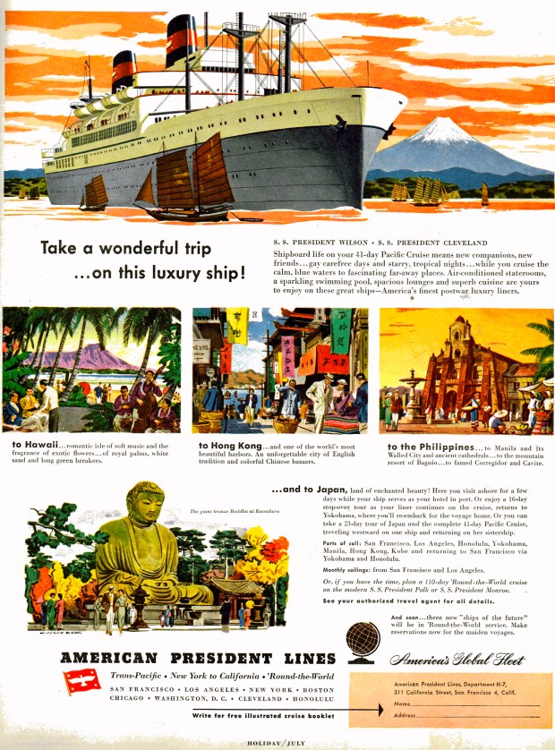 In the mid 1950’s through the 1960’s most American civilians and non-military government officials moving to Southeast Asia traveled with their families and belongings by ship. My family traveled between San Francisco and Yokohama, Japan, five times between 1959 and 1969. Each voyage took 14 days, with a morning to evening stop in Honolulu each way. As a result, I spent ten weeks on the ocean on either the USS President Wilson or the USS President Cleveland, sister ships that alternately plied that route. A most vivid memory is of passing under the Golden Gate Bridge, looking up from the deck.