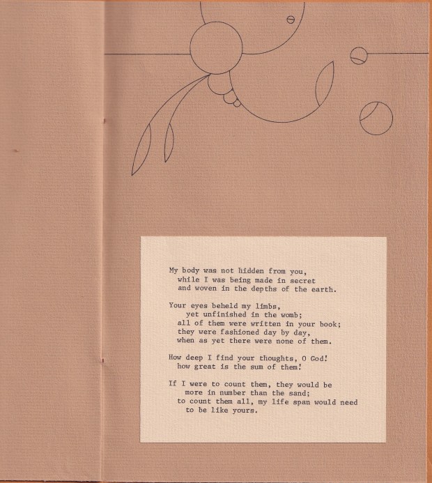 Above and below are some images of the little Psalm 139 pamphlet I created in the autumn of 1977 using a circle template, a rapidograph pen, an old-fashioned typewriter, and charcoal paper, along with a binding of stranded thread.