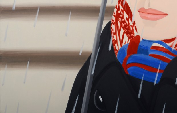 Yet, Katz’ attention to the play of light and shadow upon what he chooses to represent adds a surprising element of three dimensionality to his images. Further, though at a distance many of his paintings seem to employ strong linear demarkation to define the edges between fields of color, the artist is also adept at suggesting texture and depth in a painterly way by using subtle brush strokes that have a shading effect. The following two images help illustrate these points.