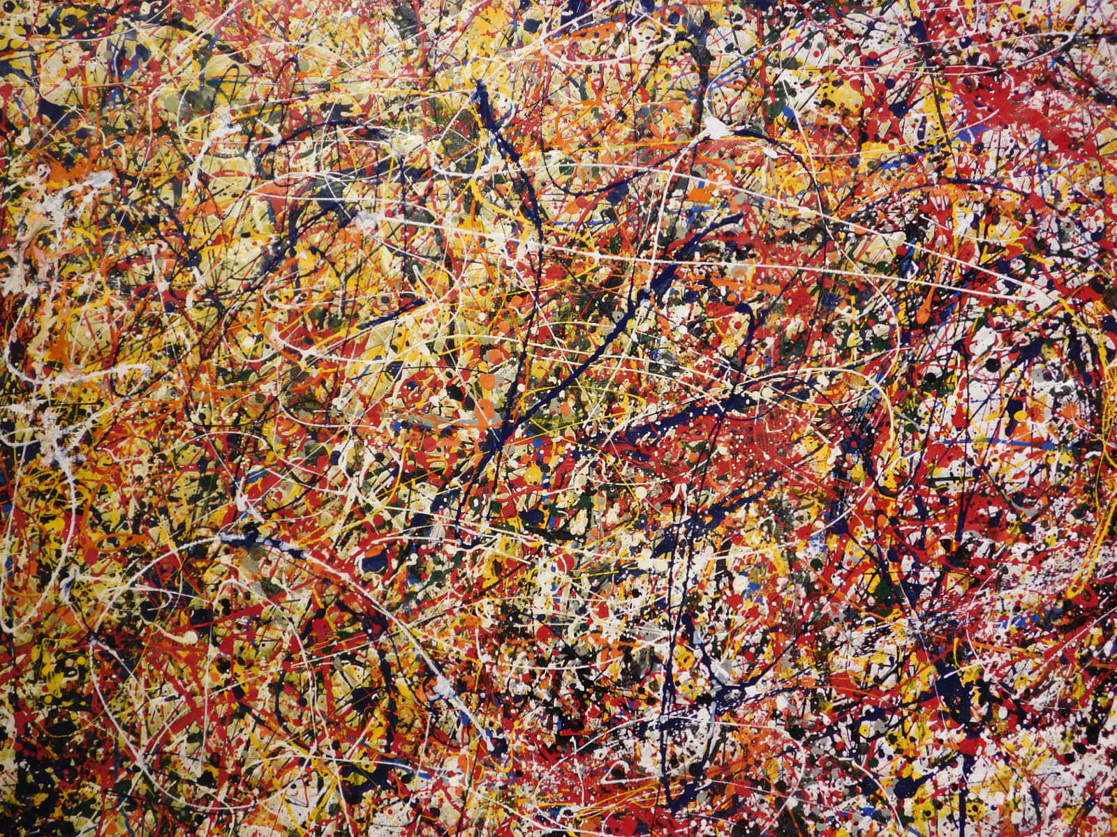 What I am calling a formed intuition within the artist’s temperament bore fruit in the form of several perceivable variables among his drip paintings. First, we can appreciate the sophistication of his color choices. Despite an initial sense that these paintings contain a cacophony of clashing streaks of full spectrum color, closer inspection reveals that Pollock often employed a limited color palette in these works, sometimes with an almost Zen-like restraint. Second, he had an undeniable eye for composition. This is discernible within the apparent chaos on the surface of his drip paintings where pattern, unexpected order, and rhythm, can convey a sense of balance. Third, the well-documented energy the artist applied to the creation of these canvases is effectively communicated by the visual results he attained, which in my experience draw the viewer in to a deepened engagement with his vision.