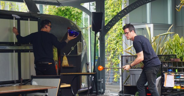 A display titled Ikebana and Float Boats is featured in a subsequent room. Having pursued glass making in Seattle and in Venice, both near significant bodies of water, Chihuly experimented with glass objects thrown into a river in Finland, where youth from the area in wooden boats helped retrieve them. Intrigued by the interaction between the objects, the light above, and the water below, the artist continued to develop these interests after traveling to the Japanese island of Niijima. There he became reacquainted with the glass globes traditionally employed by Japanese fishermen as floats for their nets, which he had first seen as a youth beach combing on Puget Sound. At the same time, Chihuly was inspired by the Japanese art of flower arranging, called Ikebana. He combined his interest in the glass globes with the inspiration provided by Ikebana and imaginatively adapted these forms within boat-shaped structures that have been displayed in galleries and upon ponds.