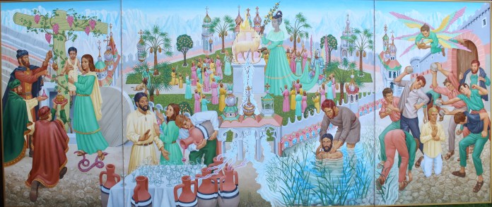 In Koenig’s Triptych, we see the Holy Mother and Child, the visit of the Magi (Jan. 6), the martyrdom of Stephen (Dec. 26), the Baptism of Christ and his first miracle at Cana (first Sunday after the Epiphany), as well as the marriage of the Lamb and the New Jerusalem (advent themes from Revelation 19).