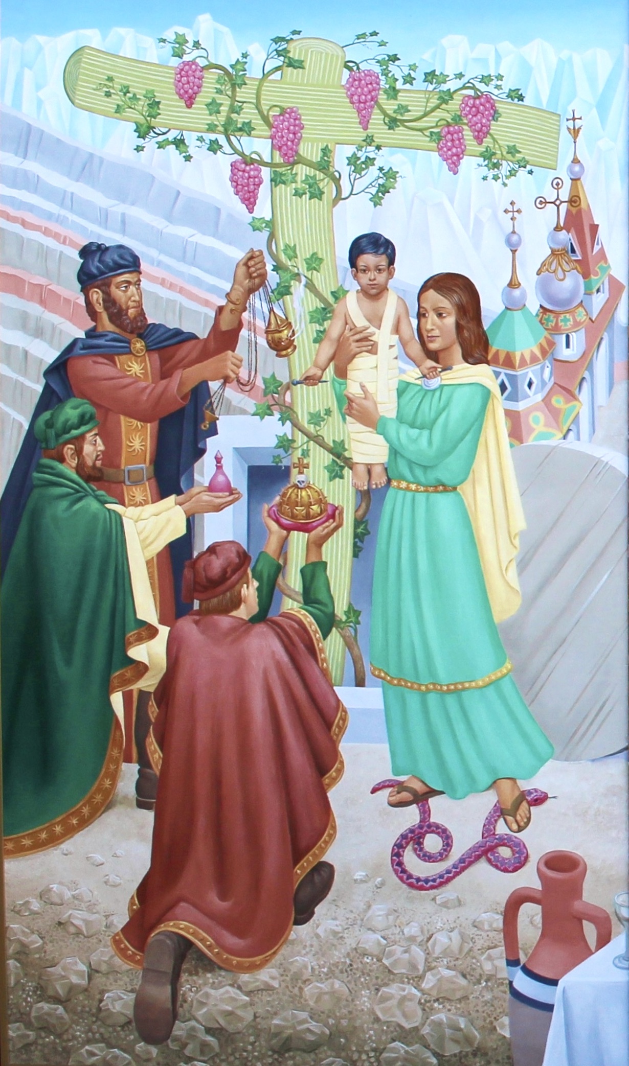 Also strongly suggestive of the later saving work of this promised child is the large split-wood cross behind the figures, which springs from an empty tomb. Its form and adornment suggests the biblical Tree of Life. The cross has a fruited vine entwining it, exemplifying Jesus’s words about the vine and its branches, and evocative of a significant number of Old Testament images. As Christmas and Epiphany worship texts remind us, the three gifts borne by the Magi are symbolic of this child’s transformative meaning for this world in God’s Providence: gold for his royal status; incense for his divinity; and myrrh for what turned out to be his only-temporary burial.