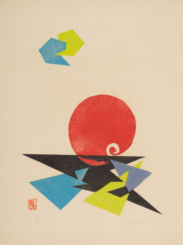 Though fully Americanized following his own immigration to America at the age of 18, Henry Sugimoto retained a deep sensitivity to the language, culture, and traditions of the land of his birth. One example of this can be found in another print featuring the setting sun and a mountain, like the image at the top of this page. The print below demonstrates how the Japanese Kanji character, Yama (for mountain, as in Fuji Yama), inspired his portrayal of a peak set against the evening sun, and reflected off the surface of the sea. Sugimoto’s interest in this word and its written form is surely no coincidence given that he was born and lived until he was 18 in Wakayama, Japan. Wakayama is the conjunction of the Japanese words for ‘mountain’ and ‘youthful.’