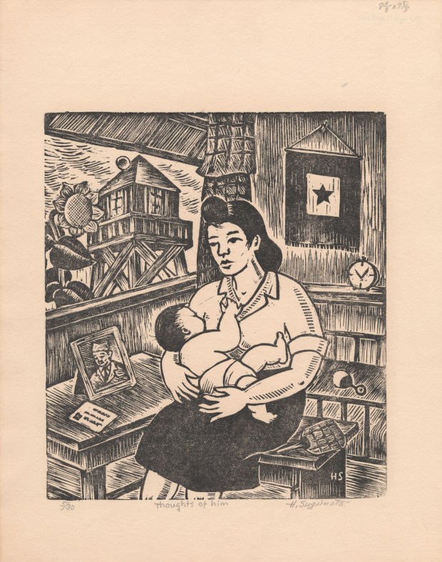 Another significant body of work in the Sugimoto collection is composed of block prints. They include a few that reflect his travels to Europe and his life in New York City. Notable among his prints are his later black and white depictions of detainee life in the crudely appointed Japanese American ‘relocation centers.’ Gradually freed up from the constraints imposed by other employment, Sugimoto shows himself in his mature work to be an accomplished graphic artist, expressing an authentic personal vision.