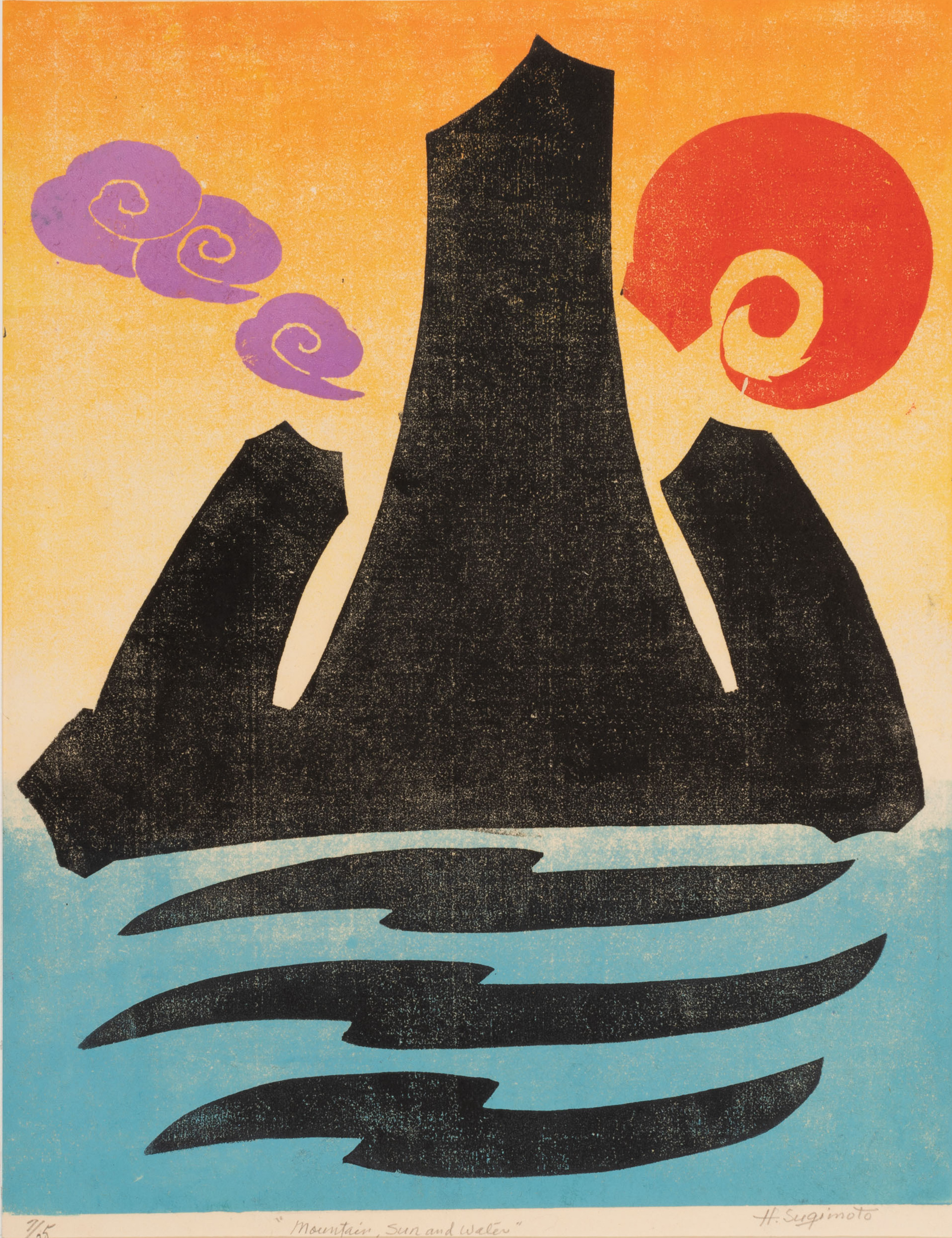 Though fully Americanized following his own immigration to America at the age of 18, Henry Sugimoto retained a deep sensitivity to the language, culture, and traditions of the land of his birth. One example of this can be found in another print featuring the setting sun and a mountain, like the image at the top of this page. The print below demonstrates how the Japanese Kanji character, Yama (for mountain, as in Fuji Yama), inspired his portrayal of a peak set against the evening sun, and reflected off the surface of the sea. Sugimoto’s interest in this word and its written form is surely no coincidence given that he was born and lived until he was 18 in Wakayama, Japan. Wakayama is the conjunction of the Japanese words for ‘mountain’ and ‘youthful.’