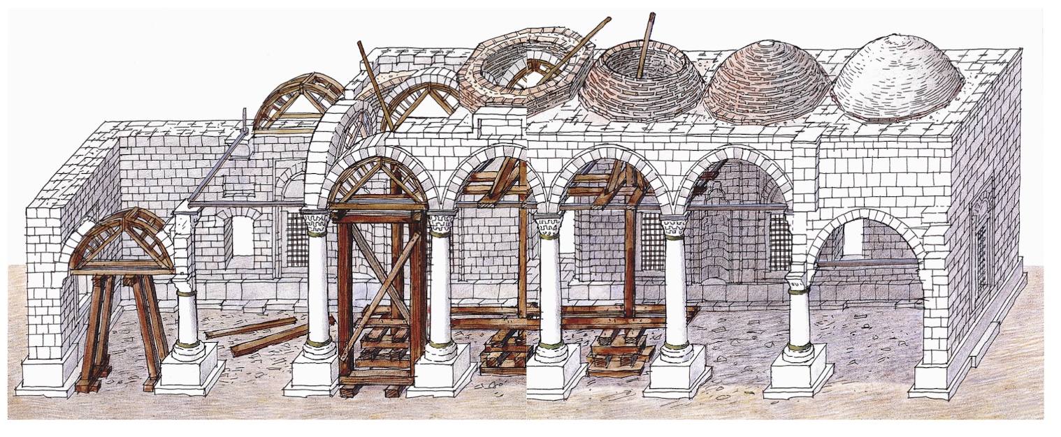 Now, how did that imaginary 16th century architect, his masons and carpenters, manage to build the magnificent dome featured in this project, and as we find in the actual Süleymaniye Mosque? Macaulay unfolds the mystery with a series of instructive drawings that give us insight into the process. Once the proper height of the walls and support piers was attained, a semi-circular structure of wood was constructed to provide the proper curvature of the intended dome (as seen below).
