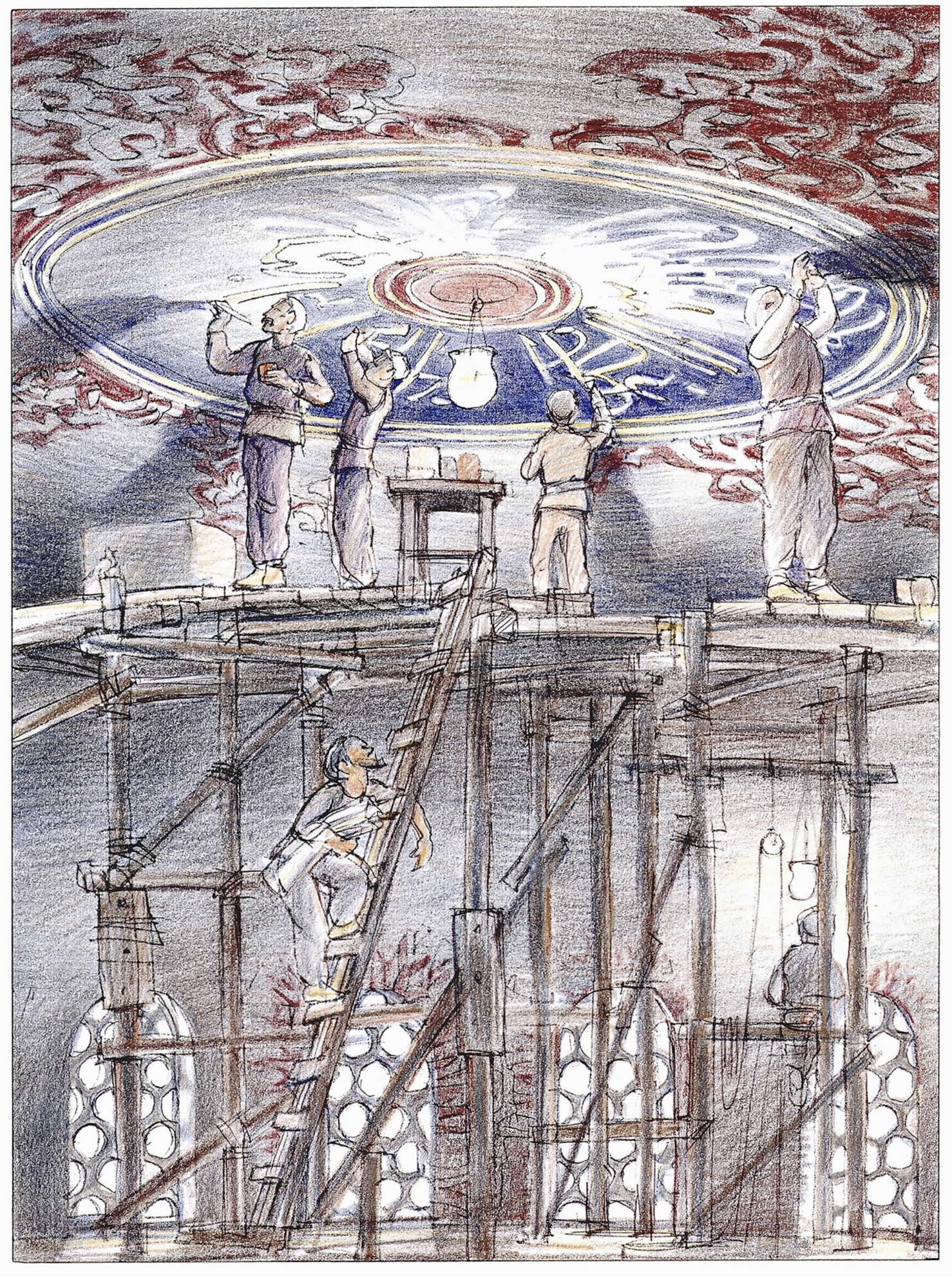 Completion of the construction of the main dome was followed by the finishing of the interior surfaces with plaster, and then with elaborate paint work, which of course involved the need for scaffolding and platforms.