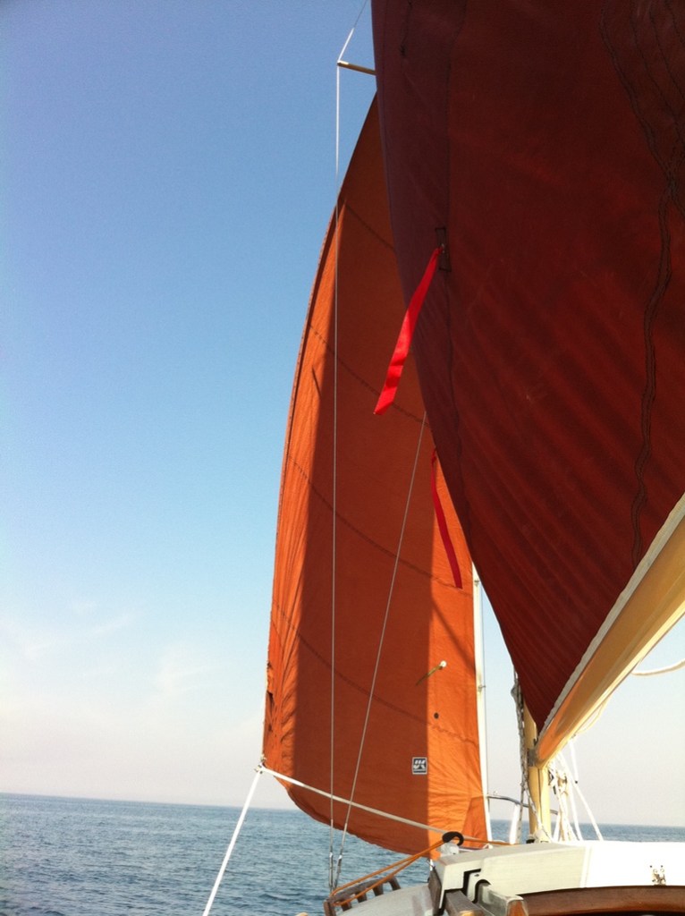 All of these features result in a boat well-suited for ‘gunkholing,’ or navigating into shallow coves and inlets. DAYSTAR can be brought right up to edge of a river or beach, though her skipper must take care to keep sand or mud from getting into the outboard engine’s impeller (water-cooling intake). On the open water, she sails well, and we can regularly reach a comfortable if not a sometimes thrilling 5 knots (or 5-6 mph) with decent wind. We have sailed her on Lake Michigan, and on the adjoining 18 mile long Lake Charlevoix, as well as on Lake Pontchartrain.