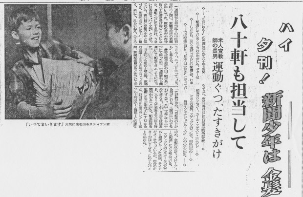 We lived in a Japanese neighborhood, and our local contacts were almost entirely Japanese. Having grown up in Japan, and being fairly fluent in Japanese, this led me to a job in our local economy. That’s how I became a ‘paper boy,’ delivering—as I remember it—about 40 or 50 newspapers, every afternoon. Before delivery, I had to insert advertisement fliers in each copy. This could make the whole bundle rather heavy. I slung them under my left arm, using something like a Judo-belt.