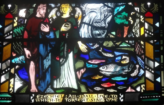 The above window by Charles Blakeman, portraying the prophecy of Jeremiah (Chapter 23) regarding a promised righteous king. Below, Blakeman’s depiction of the visionary prophecy of Ezekiel (Chapter 47.)