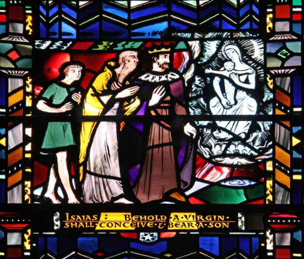 In one of the oldest churches in London, St. Etheldreda’s, we find a series of evocative stained glass windows by Charles Blakeman, modern but medieval in style. The window shown above depicts the prophet Isaiah’s encounter with King Ahaz (Isaiah, Chapter 7), which contains a quote from Isaiah’s prediction of a promised child, a prediction fulfilled in Matthew’s Gospel (Chapter 1.)