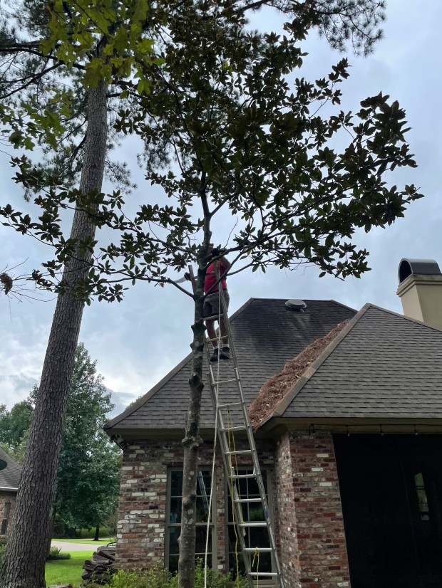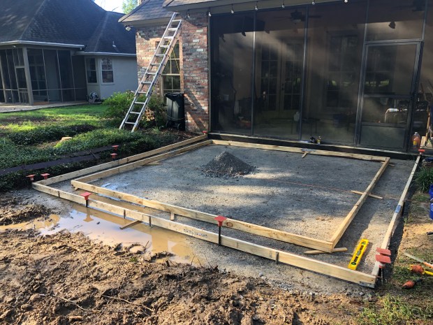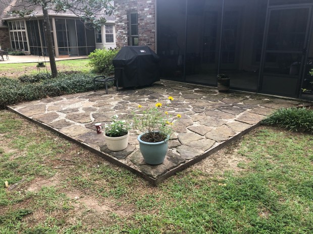 And just in time. My brother’s return flight to Seattle has loomed on the calendar, along with the daily weather forecasts. We have been most fortunate, keeping on track with the former while dealing with the latter. The photo above shows the basic work done: poured concrete edging well set; foundation for pavers put in; and the pavers themselves set in place. Two further photos may help show how this was far from a simple process.