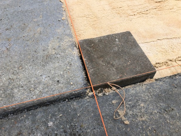 Also critical at this stage was leveling the sand, assisted by hand-holds of sand, a shovel, and a very handy 6″ spackle blade. With my brother’s home-made framing tool (depicted above), laying the pavers on a flat but slightly sloped surface was (as some might say, perhaps wrongly) ‘a piece of cake!’