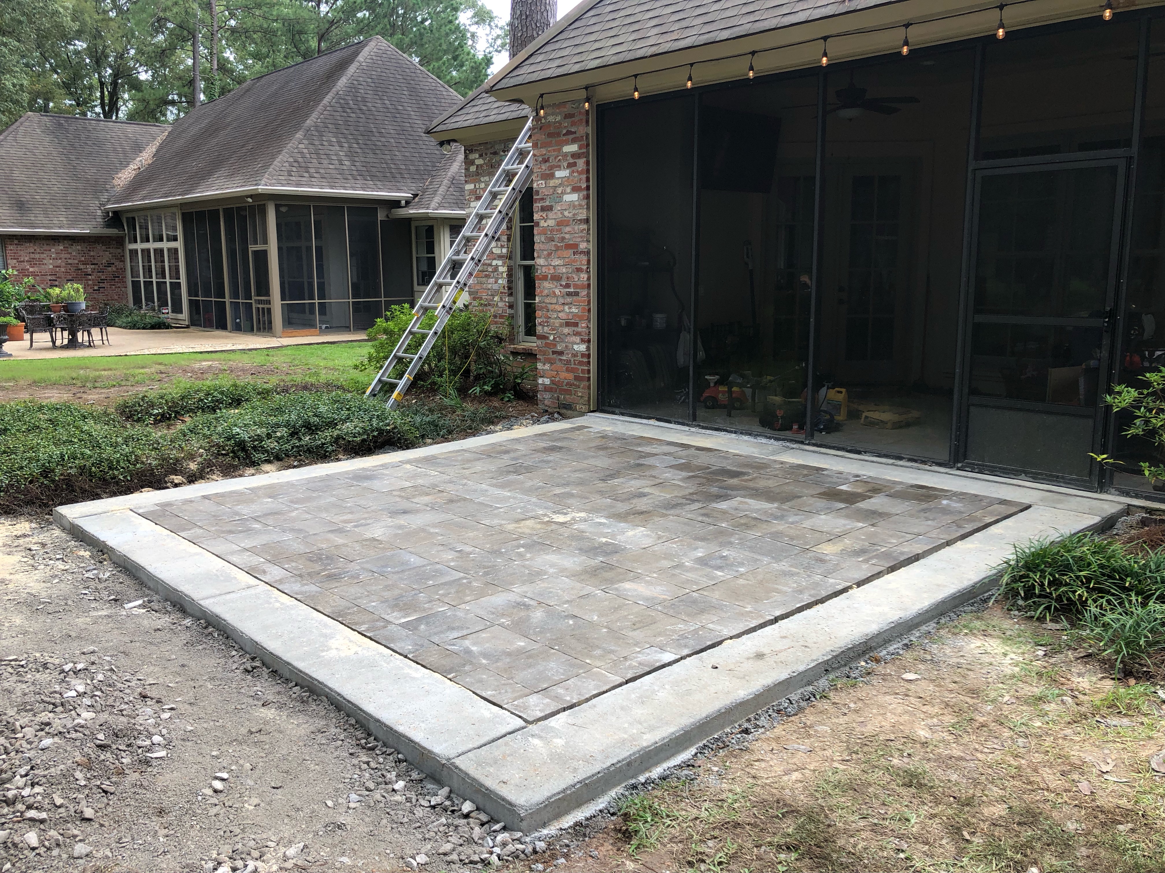 Here we are after the first few rows. We did all of them in about 5-6 hours. Though we have some edging work left to do, and putting some very fine sand between the pavers, as well as between them and the concrete edging, we have essentially achieved our goal.